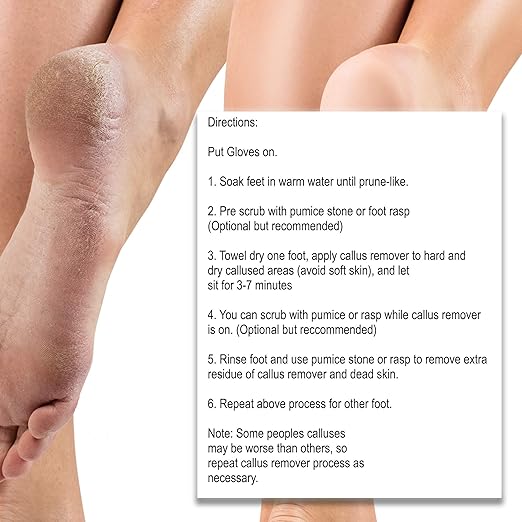 - I DON’T USUALLY GIVE FIVE STAR REVIEWS BUT THIS STUFF IS EXCEPTIONAL!” - Amazon customer “I followed the instructions to the tee on the Callus Remover. I soaked my feet for 2-3 minutes in hot water, dried them then applied a thick layer of gel to the callused area and let it sit for 3 minutes. Wiped it off and then used the foot scrubber. I rinsed off the residue and dead skin. The first use showed incredible results”